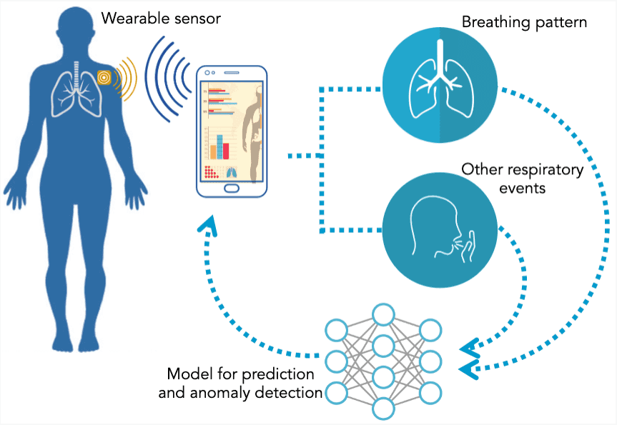- Continuous monitoring of respiration has not been possible due to lack of non-invasive sensors. Typically, respiratory tests are limited to clinical settings and cannot be performed continuously on a daily basis.